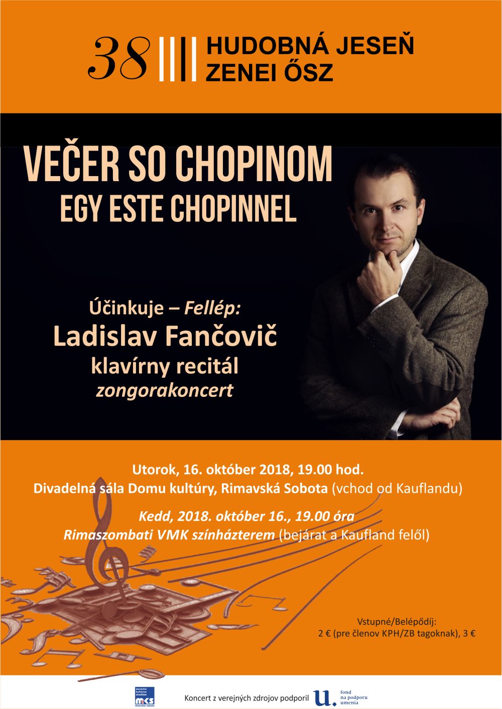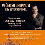 Cyklus koncertov vážnej hudby, 38. ročník Hudobnej jesene, bude v utorok, 16. októbra o 19.00 hod. pokračovať klavírnym recitálom vynikajúceho pianistu Ladislava Fančoviča s názvom Večer so Chopinom, ktorý sa intenzívne venuje interpretácii diel tohto významného hudobného skladateľa. Vstupné: 3€ / 2€ pre členov KPH / predaj vstupeniek na mieste.
