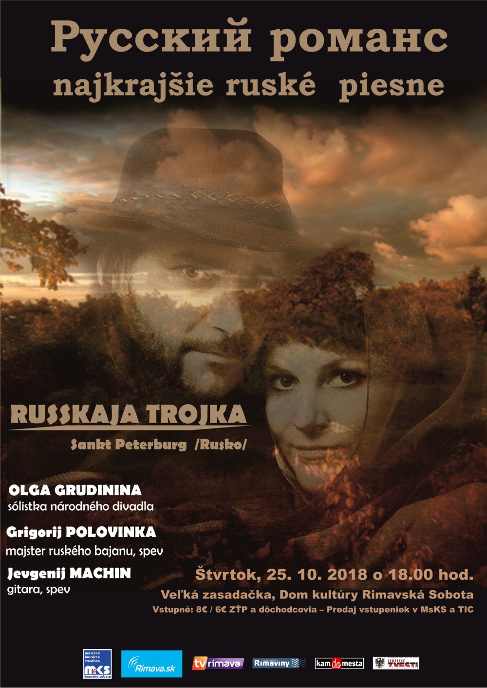 Najkrajšie ruské piesne RUSSKIJ ROMANS v podaní kapely Russkaja trojka zo St. Peterburgu si môžete prísť vypočuť do Domu kultúry vo štvrtok, 25. októbra o 18.00 hod. Na turné do Európy s najznámejšími ruskými piesňami prichádza sólistka národného divadla v Petrohrade Oľga Grudinina so svojim ansámblom: Grigorij Polovinka / bajan, spev a Javgenij Machin / gitara, spev. Na chvíľu Vás vtiahnu do sveta známych ruských piesní, ktoré zdomácneli na svetových pódiách a ktoré si určite zaspievate spolu v Rimavskej Sobote. Vstupné 8€ / 6€ ZŤP a dôchodcovia. Predaj vstupeniek v MsKS a TIC.