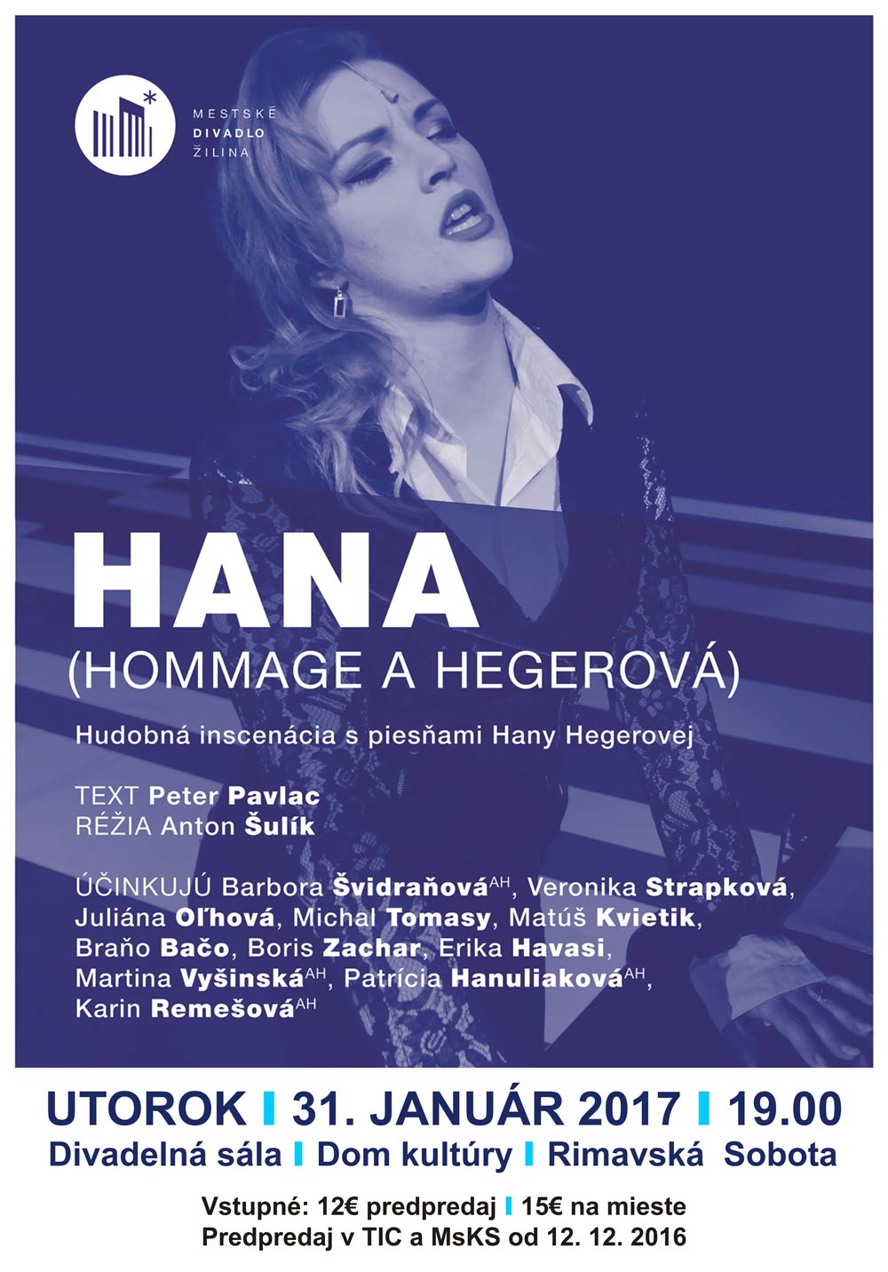 Posledný voľný deň – nedeľa, 29. januára, bude v znamení oddychu. Počas neho môžete načerpať sily na utorkové prvé tohtoročné predstavenie v Dome kultúry v Rimavskej Sobote. Dosky divadelnej sály budú od 19:00 hod. patriť predstaveniu s názvom Hana (Hommage à Hegerová) v podaní Žilinského divadla. Príbeh predstavenia nás zavedie do zákulisia regionálneho divadla, v ktorom sa pripravuje hudobno-divadelný večer o Hane Hegerovej. Hlavná hviezda súboru, na ktorej je celá produkcia postavená, sa však nečakane rozhodne z divadla odísť. V predstavení ju má narýchlo nahradiť mladá absolventka herectva z hlavného mesta. Jej príchod rozvíri zdanlivo pokojné provinčné vody a postupne sa dozvedáme, že nie všetko je také, ako sa na prvý pohľad zdá. Hegerovej piesní.