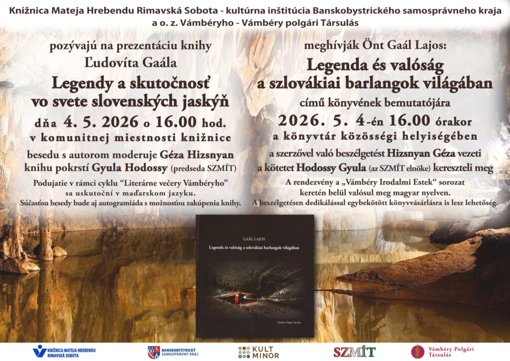 Knižnica v Rimavská Sobota pozýva verejnosť na zaujímavú besedu s Ľudovítom Gaálom s názvom Legenda a skutočnosť vo svete slovenských jaskýň. Podujatie sa uskutoční 4. mája 2026 o 16:00 hod. v komunitnej miestnosti Knižnica Mateja Hrebendu.