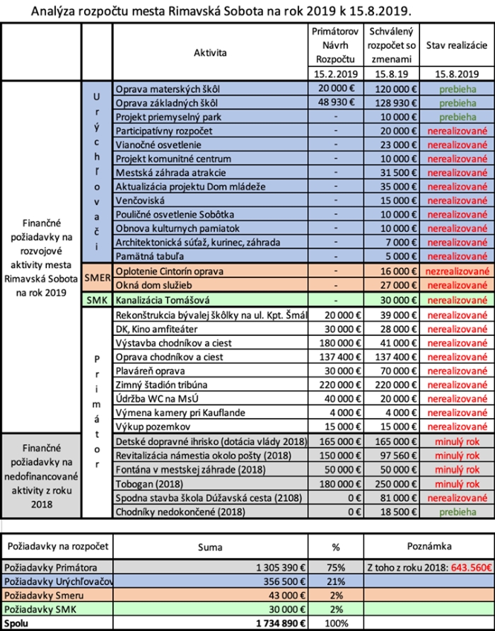 Zhrnuté a podčiarknuté. Primátor nemá právo vyhovárať sa, že nemá dostatok financií, pretože má k dispozícii v rozpočte najviac financií v histórii Rimavskej Soboty! Ak má pocit, že sa nič v našom meste nerobí, možno by nezaškodilo, ak by konečne začal aspoň s realizáciou aktivít, ktoré si sám navrhol, ale do dnešného dňa ich za 8 mesiacov nedokázal spraviť. A možno by mal o 650.000€ tento rok viac, ak by ich neutratil už ten minulý rok.