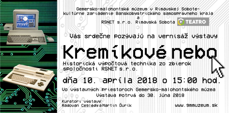 Počítače, notebooky či smartfóny v súčasnosti tvoria neoddeliteľnú súčasť nášho života. Mladšia generácia si možno ani nevie predstaviť ako to vyzeralo v počiatkoch digitálneho veku. Jeho „pravek“ však priblíži výstava Kremíkové nebo v priestoroch Gemersko-malohontského múzea, ktorá verejnosti predstaví historickú výpočtovú techniku zo zbierok spoločnosti RS NET Rimavská Sobota. Vernisáž výstavy sa uskutoční v utorok, 10. apríla o 15:00 hod. Rimava.sk o tom informoval Alexander Botoš z GMM.