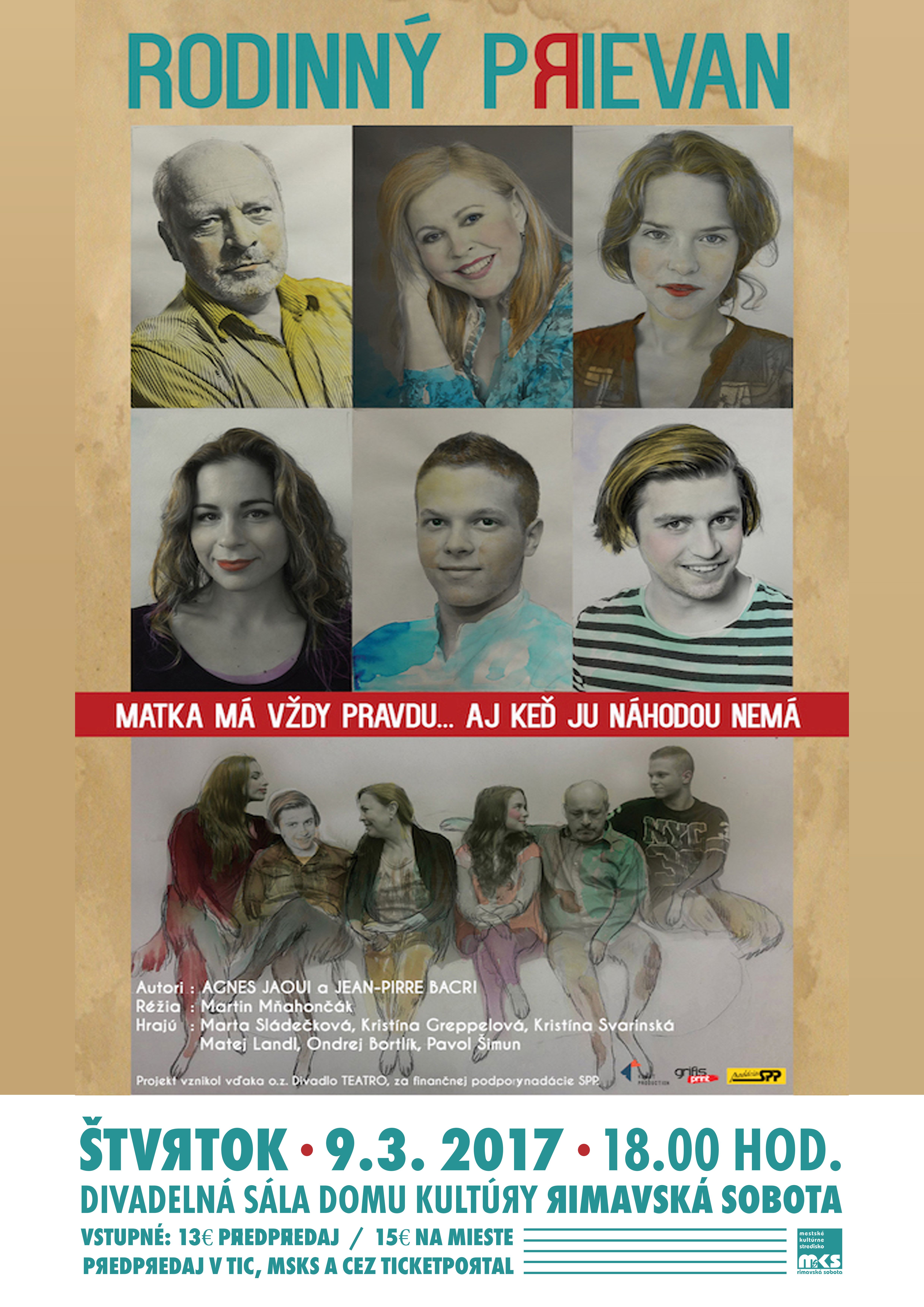 Rodinný prievan, taký je názov ďalšej skvelej komédie, ktorá je naplánovaná na štvrtok, 9. marca o 18.00 hod. V komédii z rodinného prostredia sa v divadelnej sále rimavskosobotského Domu kultúry predstavia známi herci - Marta Sládečková, Matej Landl, Kristína Svarinská, Kristína Greppelová, Pavol Šimun a Ondrej Bortlík. Súčasná komédia načiera do rodinných vzťahov a vynáša na povrch rôzne situácie. Je tu matka, ktorá má pravdu aj vtedy, keď ju nemá, no sú tu predovšetkým traja muži a tri ženy, čo nikdy neveští nič dobré...Overené francúzske dielo si uchováva francúzsky šarm a dáva mu naviac slovenský prínos v podobe „klapiek na očiach“, ktorými budú postavy obdarené a prináša mikroskopický náhľad do života jednej rodiny, ktorá je „postihnutá“ tým najkrajším spôsobom. „Myslím, že tento typ komédie bude veľmi vhodným darčekom pre všetky ženy ku nášmu sviatku,“ uzavrela Jutková. Vstupné: 13 eur predpredaj / 15eur na mieste. Predpredaj vstupeniek v MsKS a TIC, aj cez Ticketportal.