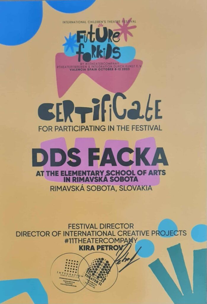 Detský divadelný súbor FACKA pri ZUŠ v Rimavskej Sobote dosiahol mimoriadny úspech, aký sa nepodarí každý deň – ich autorská inscenácia „Mama, kde si?!“ sa dostala medzi deväť najlepších detských divadelných predstavení sveta. Zo štyridsiatky prihlásených súborov si tak vybojovali miesto vo finálovej deviatke medzinárodného festivalu FUTURE FOR KIDS, ktorý sa konal od 8. do 12. októbra v španielskej Valencii.