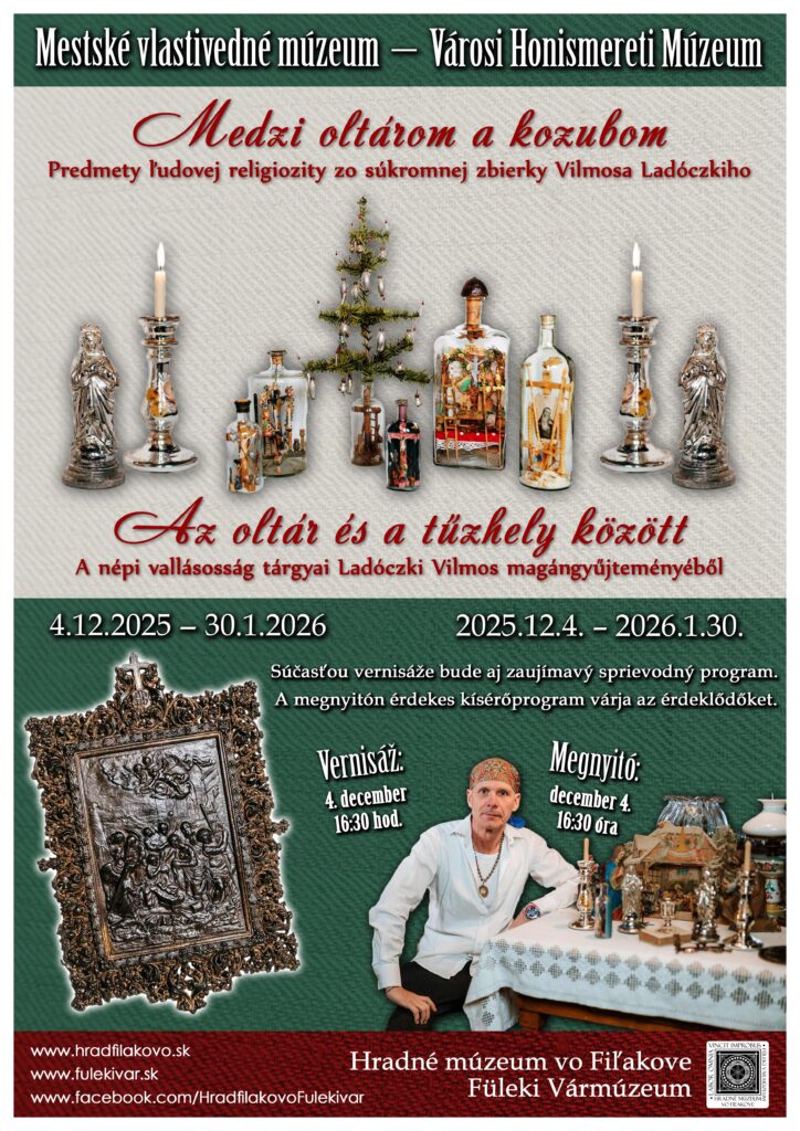 Výstava s poetickým názvom Medzi oltárom a kozubom - predmety ľudovej religiozity zo súkromnej zbierky Vilmosa Ladóczkiho, priblíži svet predmetov, ktoré kedysi sprevádzali každodenný život rodín. Od okamihov narodenia až po tiché večery pri modlitbe.