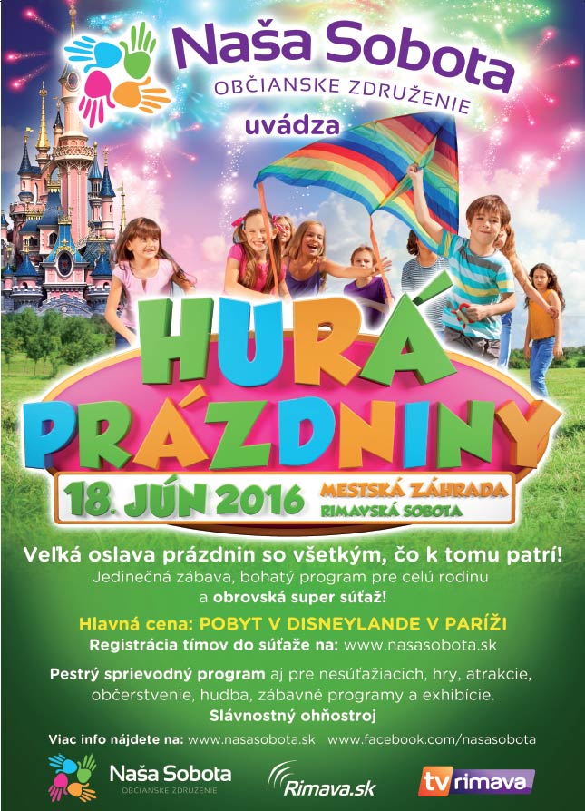Podujatie plné hier, súťaží, dobrôt a hlavne zážitkov umocní aj ohňostroj, ktorý urobí krásnu a najmä svetelnú bodku za dňom, ktorý už po tretí raz symbolizuje blížiace sa dvojmesačné voľno. Takže Hurá na prázdniny, a to do Mestskej záhrady v Rimavskej Sobote v sobotu, 18. júna. Vstup na podujatie je voľný! Viac informácií o podujatí nájdete na webovej stránke organizátora akcie o.z. Naša Sobota www.nasasobota.sk, alebo na ich facebookovej stránke https://www.facebook.com/nasasobota.