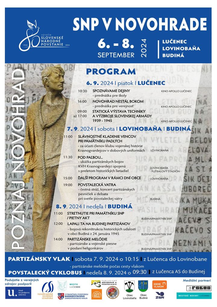 Víkendové dobové podujatie s názvom SNP v Novohrade je pripravné od 6. do 9. septembra pod záštitou Novohradského osvetového strediska v Lučenci. V piatok sa uskutočnia prednášky a výstava v Kine Apollo v Lučenci, v sobotu bude pripravený povstalecký program v Lovinobani a Budinej. V druhej menovanej obci program ukončia v nedeľu, a to partizánskymi melódiami.