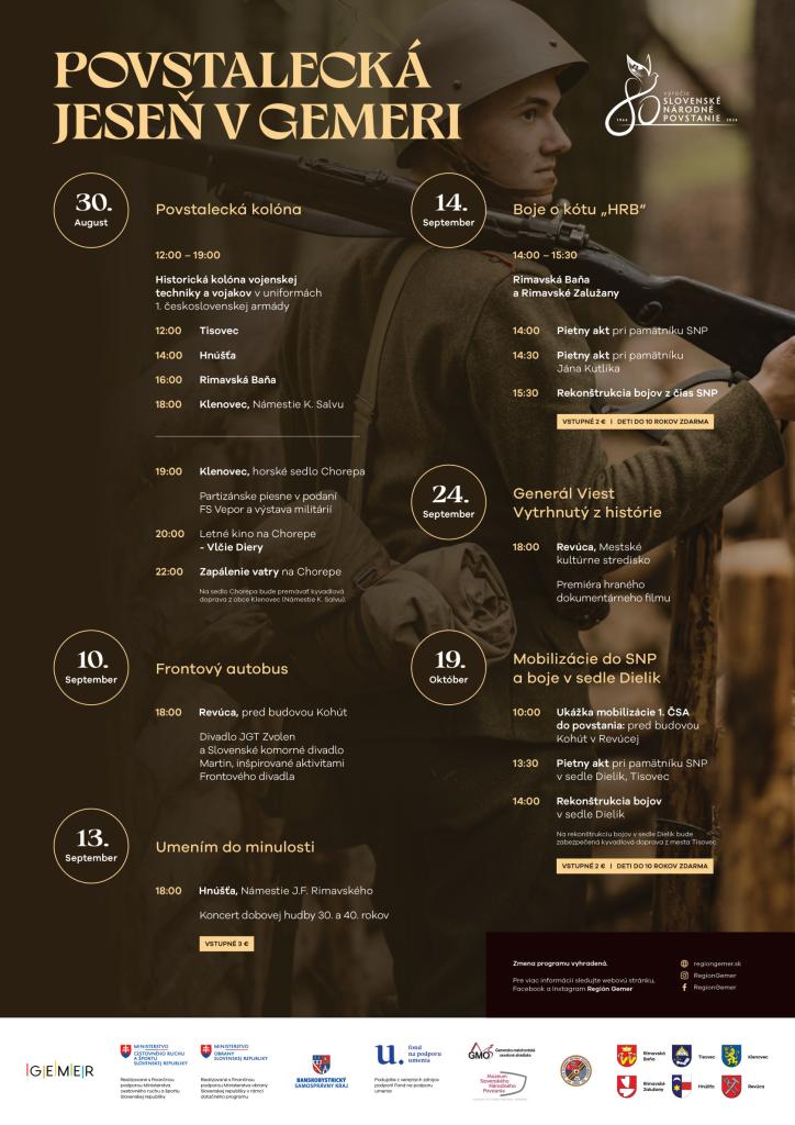 Do Revúcej zavíta 10. septembra divadlo, v Hnúšti bude 13. septembra pripravený koncert, na druhý deň bude v Rimavskej Bani a Rimavských Zalužanoch pripravný program v podobe rekonštrukcie bojov z čias SNP, 24. septembra bude v Revúcej pripravená premiéra dokumentárneho filmu a povstaleckú jeseň ukončí program v sedle Dielik, a to 19. októbra.