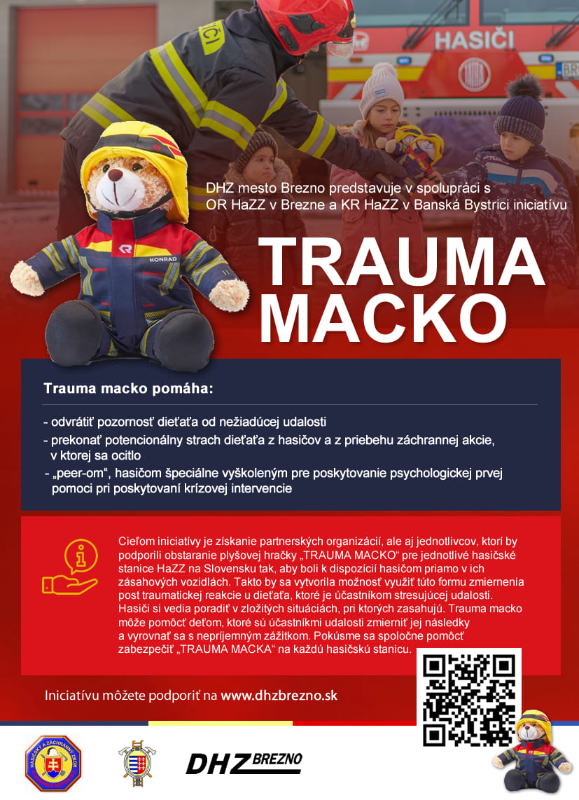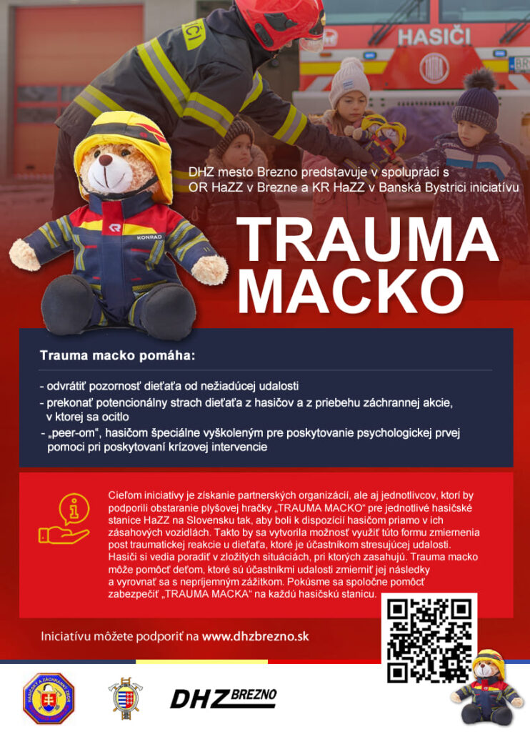 Dobrovoľní hasiči z Brezna pred dvoma rokmi spustili jedinečný projekt, ktorý dnes pomáha deťom po celom Slovensku. Iniciatíva nazvaná Traumamacko zabezpečuje plyšové medvedíky do zásahových vozidiel hasičov, kde slúžia ako okamžitá psychologická pomoc pre deti zasiahnuté krízovými situáciami.