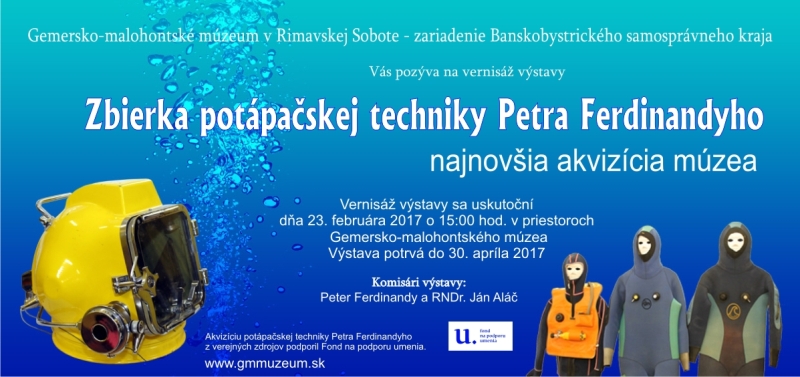 „Gemersko-malohontské múzeum v Rimavskej Sobote získalo do svojich zbierok vďaka podpore z Fondu na podporu umenia na rok 2016 unikátnu zbierku historickej potápačskej techniky od zberateľa, potápača, inštruktora potápania, ale i cestovateľa Petra Ferdinandyho z Revúcej,“ uviedol pre Rimava.sk Ján Aláč z Gemersko-malohontského múzea. Ako ďalej priblížil, Peter Ferdinandy budovaniu tejto jedinečnej zbierky venoval štyri desaťročia svojho života.