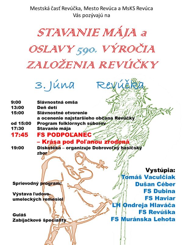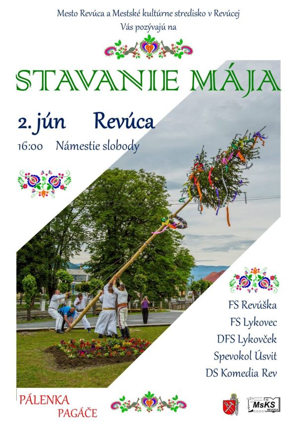 Dnešné popoludnie, 2. júna, bude v Revúcej patriť i stavaniu mája. Od 16-tej hodiny na Námestí slobody vystúpia aj folklórne súbory, detské súbory i divadelné súbory. Nebude však chýbať ani občerstvenie. Podvečer 2. júna si užijú aj naši najmenší. Pre nich je na nádvorí Čierneho orla v Rimavskej Sobote pripravené divadelné predstavenie Pipi, ktoré je súčasťou 26. ročníka celoštátnej súťaže a prehliadky ochotníckeho divadla dospelých hrajúcich pre deti pod názvom Divadlo a deti 2017. Vstup na predstavenie je voľný.