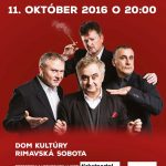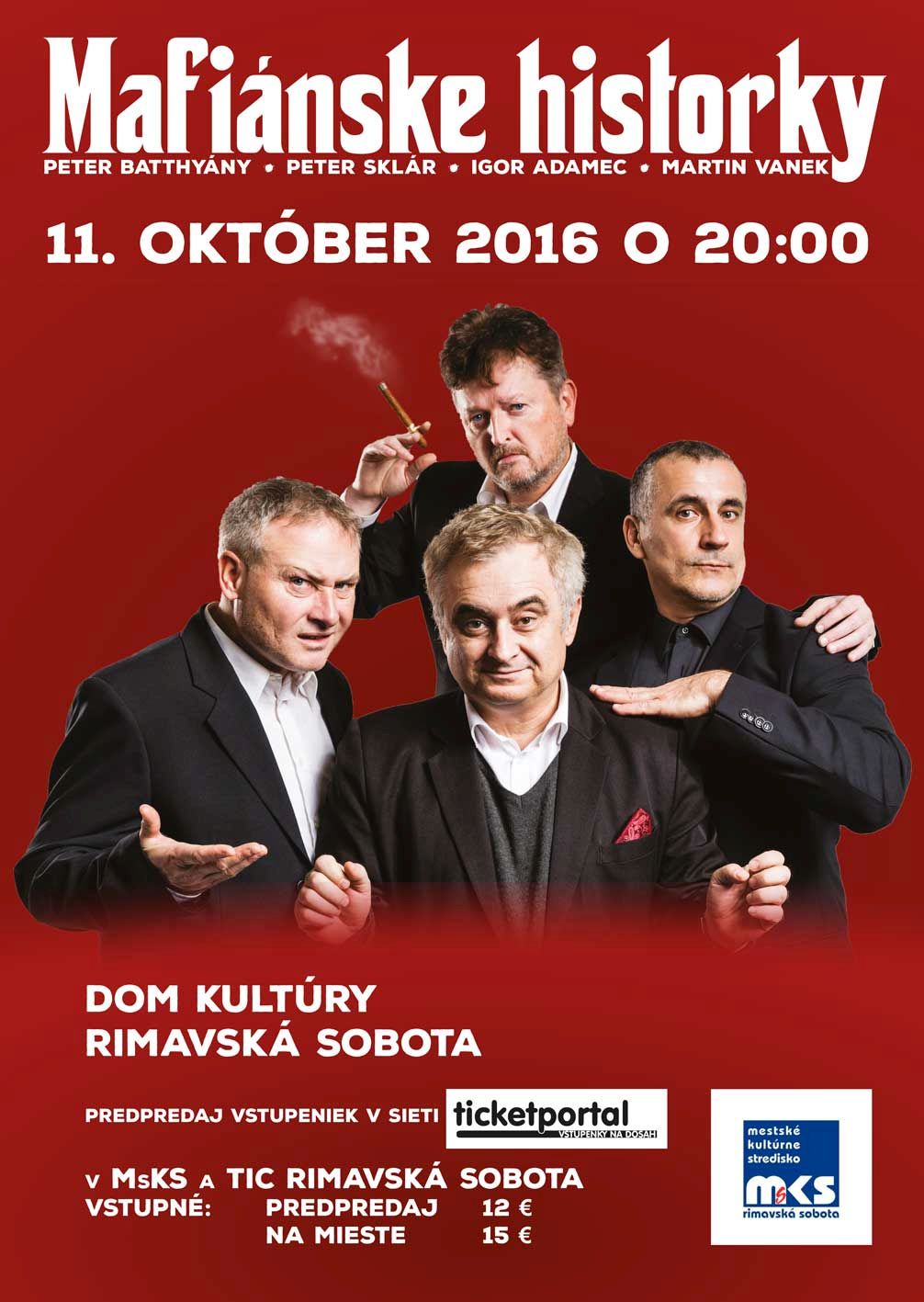 Ďalším skvelým podujatím bude divadelná komédia Mafiánske historky, ktorá vznikla začiatkom tohto tisícročia a postupne obletela celé Slovensko. Spolu 250 repríz radí tento divadelný projekt medzi najúspešnejšie. Na javisku Domu kultúry Vás v utorok, 11. októbra o 20.00 hod. zabaví skvelá herecká štvorica: Peter Batthyány, Peter Sklár, Martin Vanek a Igor Adamec. Vstupné: 12 eur v predpredaji / 15 eur na mieste. Predpredaj v TIC a MsKS. Hra vznikala priamo na divadelných doskách interakciou hercov a režiséra (Karol Vosátko), a je obohatená množstvom improvizačných vsuviek jednotlivých protagonistov, preto každé jedno predstavenie možno považovať za jedinečné. Predstavenie nie je vhodné pre divákov do 15 rokov!