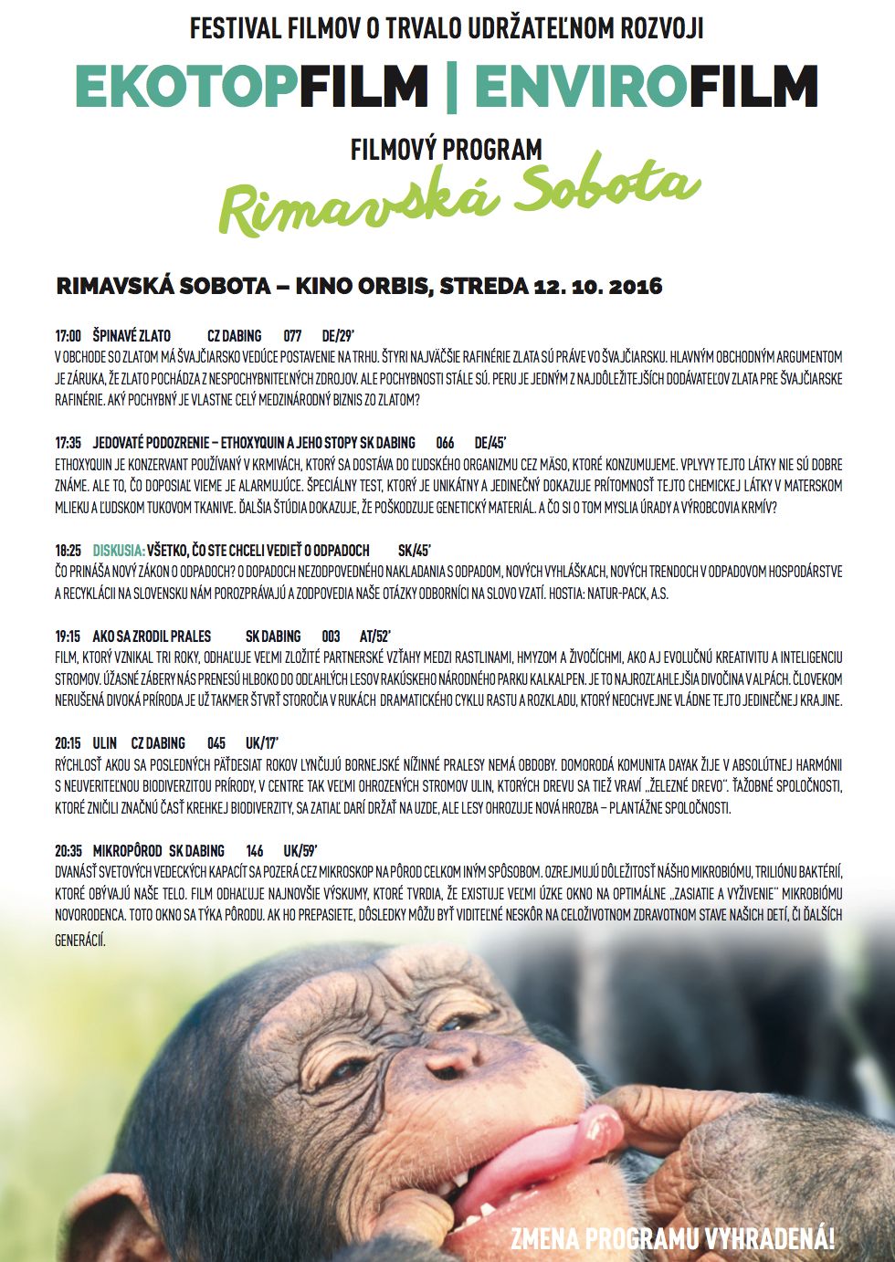 Ekotopfilm - Envirofilm sa uskutoční v kine Orbis v Rimavskej Sobote, a to v stredu, 12. októbra. Jeho program začína dopoludnia Junior festivalom, ktorý je určený žiakom a študentom základných a stredných škôl. Festival pokračuje večerným programom pre širokú verejnosť. Popri premietaní piatich víťazných filmov je pripravená aj zaujímavá diskusia s názvom Všetko, čo ste chceli vedieť o odpadoch. „Filmový festival považujeme za najväčšie eko-podujatie svojho druhu v histórii Slovenska a veľmi nás teší, že sme už druhý rok jeho aktívnou súčasťou. Najmä v mestách, kde naša spoločnosť zabezpečuje triedený zber odpadu a stará sa o recykláciu, sme pripravili pre deti vlastný zážitkový program. Naši odborníci budú následne diskutovať aj s verejnosťou na podvečerných diskusiách k tematike odpadov,“ povedal hosť diskusie Michal Sebíň, riaditeľ spoločnosti Natur-pack.