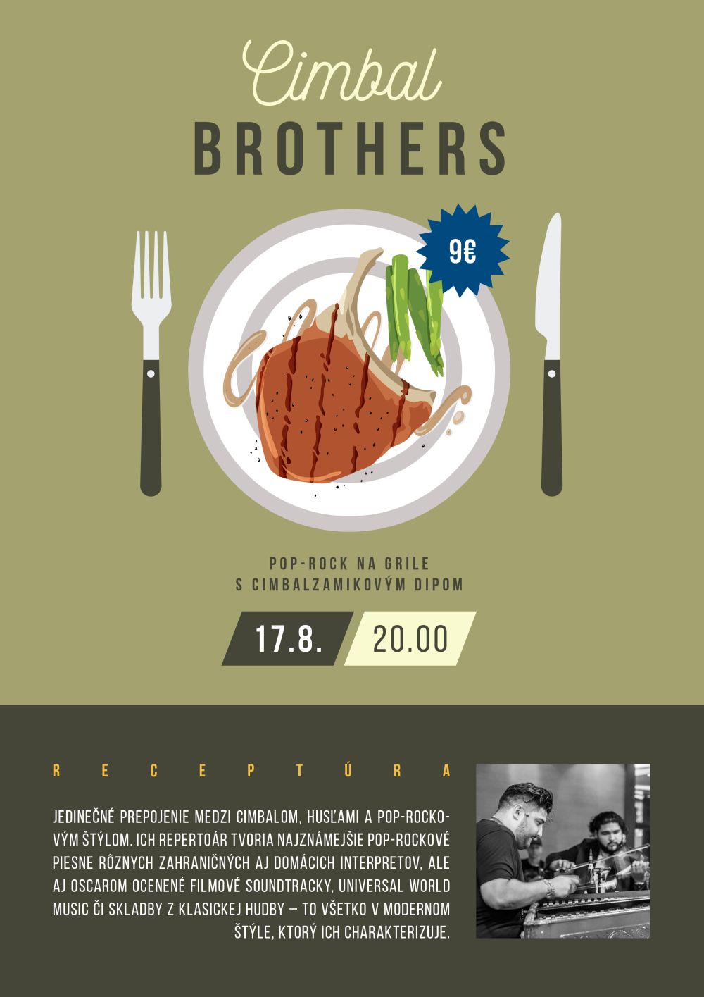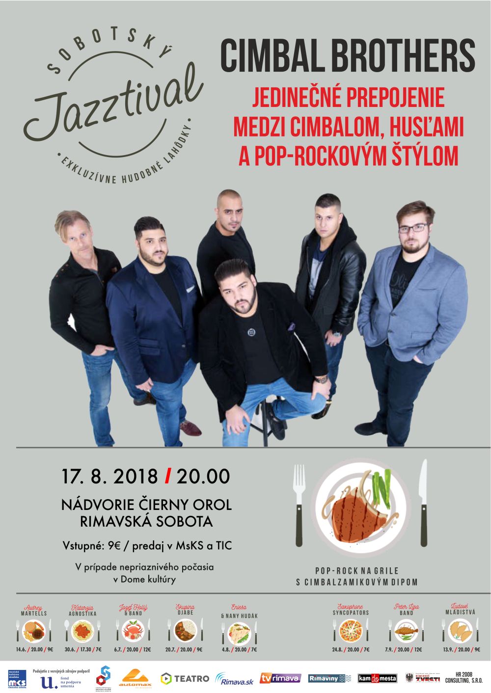 Na jedinečné prepojenie medzi cimbalom, husľami a pop-rockovým štýlom sa môžeme tešiť v piatok, 17. 8. o 20.00 hod. Na nádvorí Čierneho orla v rámci Sobotského Jazztivalu privítame skupinu Cimbal Brothers, ktorej repertoár tvoria najznámejšie hity zahraničných i domácich interpretov, ale aj Oscarom ocenené filmové soundtracky, universal world music či sladby z klasickej hudby a to všetko v modernom štýle, ktorý ich charakterizuje. Vstupné: 9€, predaj vstupeniek v MsKS, TIC a na mieste.