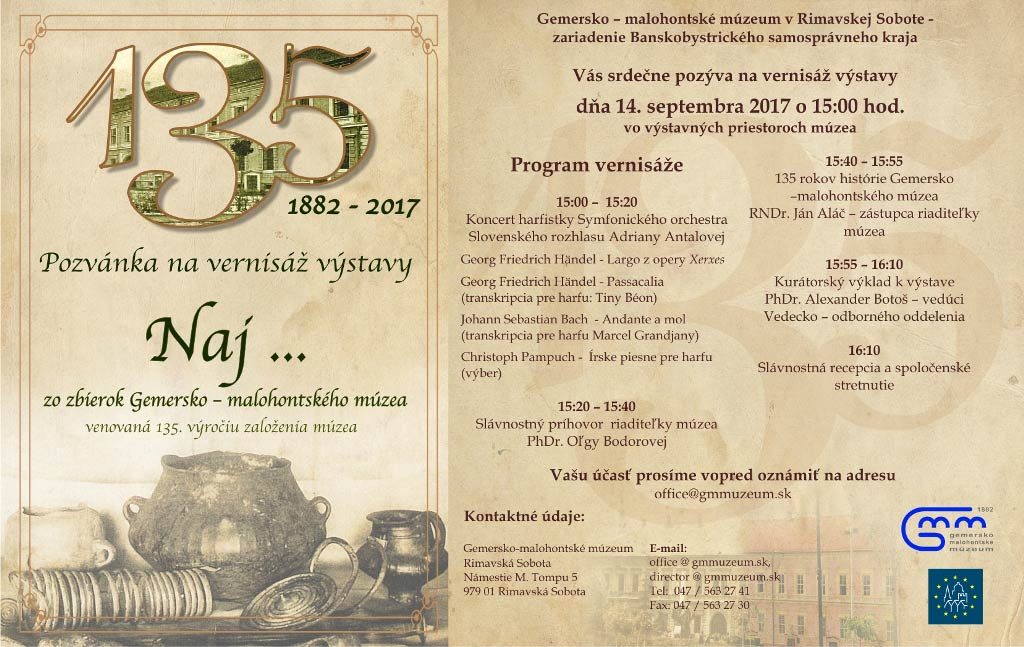 Múzeum však tento mesiac oslávi aj 135. výročie svojej existencie. Ako ďalej Rimava.sk informovala Martina Oštrom Mareková, PR referentka, múzeum svoju históriu začalo písať 3. septembra 1882 a tým sa radí medzi piate najstaršie múzeum na Slovensku. Podľa jej slov tejto významnej historickej udalosti bude venovaná výstava „Naj...zo zbierok Gemersko-malohontského múzea“, ktorej vernisáž sa uskutoční vo štvrtok, 14. septembra o 15:00 hod. Slávnostná vernisáž výstavy bude zahájená harfovým koncertom v podaní harfistky Symfonického orchestra Slovenského rozhlasu - Adriany Antalovej. „Výstava predstaví históriu múzea od jeho založenia v roku 1882 a viac ako 60 zbierkových predmetov z odborov prírodné vedy, archeológia, história, etnológia, dejiny umenia a historický knižničný fond, ktoré majú nadregionálny význam respektíve sú svojou múzejnou hodnotou výnimočné a raritné do takej miery, že je ich možné označiť prívlastkom „naj“, ako napríklad najťažší, najmenší alebo najstarší zbierkový predmet, ale i najnovšie akvizície a mnoho ďalších,“ poznamenala Mareková.
