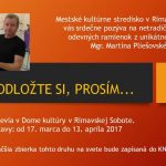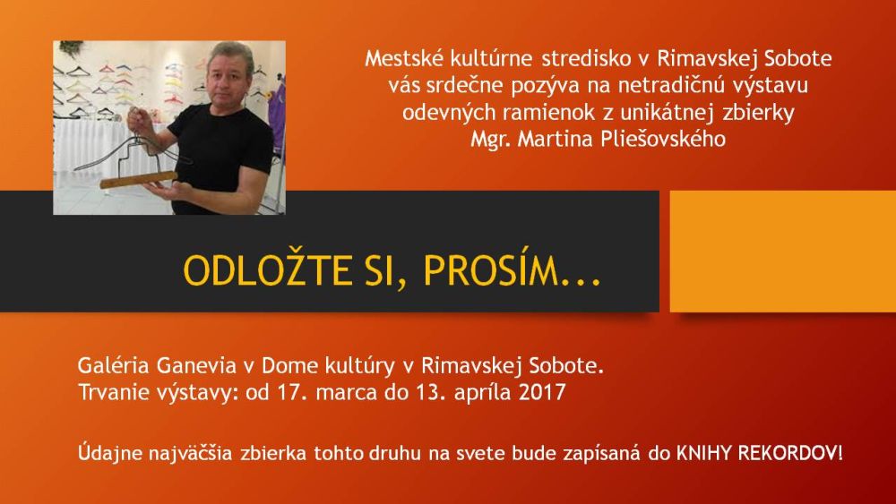 Jedným z prvých podujatí, ktoré stojí za to navštíviť, je unikátna a raritná výstava vešiakov Hnúšťana Martina Pliešovského s názvom Odložte si, prosím...Že neviete o čo ide? Tak vám to prezradíme. Ide o kolekciu 700 kusov rôznych typov odevných ramienok, ktoré zberateľ Pliešovský zozbieral po dobu piatich rokov. Ak si neviete predstaviť aké rôzne môžu byť vešiaky, tie historické, ale aj vychytené kúsky, príďte na výstavu, ktorú spolu s majiteľom zbierky otvoria už dnes, 17. marca o 15.30 hod. v Galérii Ganevia v Dome kultúry v Rimavskej Sobote. Údajne najväčšia kolekcia tohto druhu na svete bude zapísaná do Knihy rekordov. Výstava potrvá do 13. apríla a pozrieť si ju môžete od pondelka do piatku, v čase od 8.00 – 16.00 hod. Vstup zdarma. Piatkový podvečer môžete stráviť aj na regionálnej prehliadke amatérskej a nezávislej filmovej a video tvorby Cineama 2017. Uskutoční sa v priestoroch Gemersko-malohontského osvetového strediska v Rimavskej Sobote od 17:00 hod.