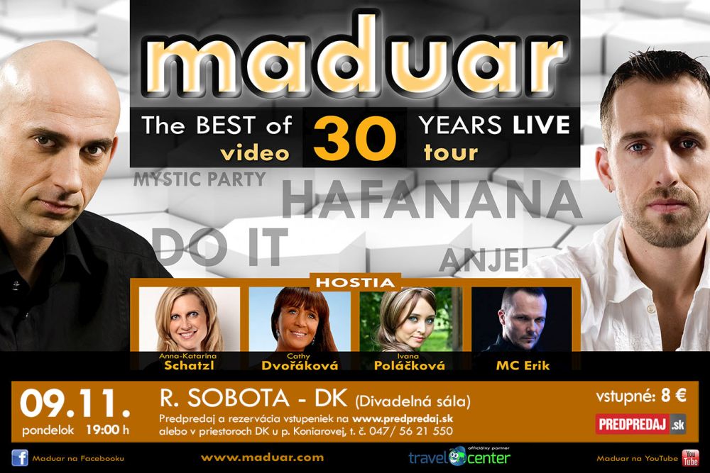 Divadelná sála Domu kultúry bude po Kandráčovcoch patriť domácim. V pondelok, 9. novembra o 19.00 hod. sa pri príležitosti 30. výročia založenia skupiny predstaví všetkým známy MADUAR aj so svojimi hosťami. Cena vstupeniek na ich Videotour je 8 eur a zakúpiť ich môžete v MsKS.