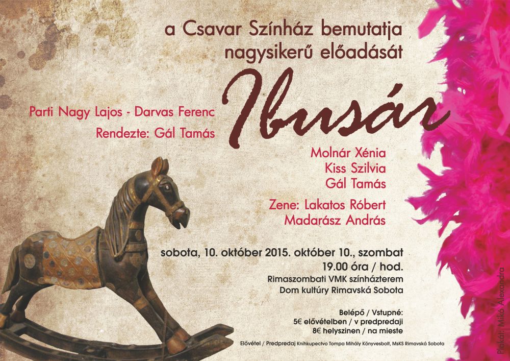 V sobotu, 10. októbra o 19.00 hod. sa v divadelnej sále Domu kultúry taktiež odohrá DIVADLO CSAVAR: IBUSÁR. „V predstavení účinkuje Gemerčanka Xénia Molnár a Tamás Gál, aktuálny držiteľ ocenenia Dosky 2015 za najlepší mužský herecký výkon sezóny, za postavu Zsolta Vidru v inscenácii Spiatočka/Rükverc Divadla Thália,“ doplnila Špitalová a dodala, že vstupné v predpredaji v Kníhkupectve M. Tompu a MsKS je 5 eur, na mieste 8 eur.
