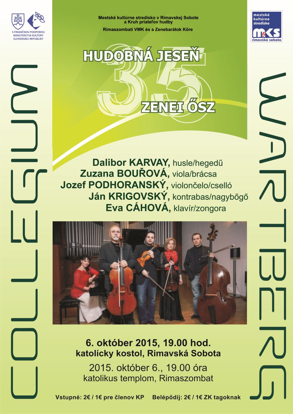 Ako ďalej Rimava.sk informovala Regina Špitalová z MsKS v utorok, 6. októbra o 19.00 hod. sa v rímsko-katolíckom kostole predstaví kvinteto COLLEGIUM WARTBERG v zložení Dalibor Karvay / husle, Zuzana Bouřová / viola, Jozef Podhoranský / violončelo, Ján Krigovský / kontrabas a Eva Cáchová / klavír. Ako poznamenala koncert je súčasťou 35. ročníka Hudobnej jesene. Vstupné je 2 eurá, pre členov KPH 1 euro, predaj vstupeniek na mieste.