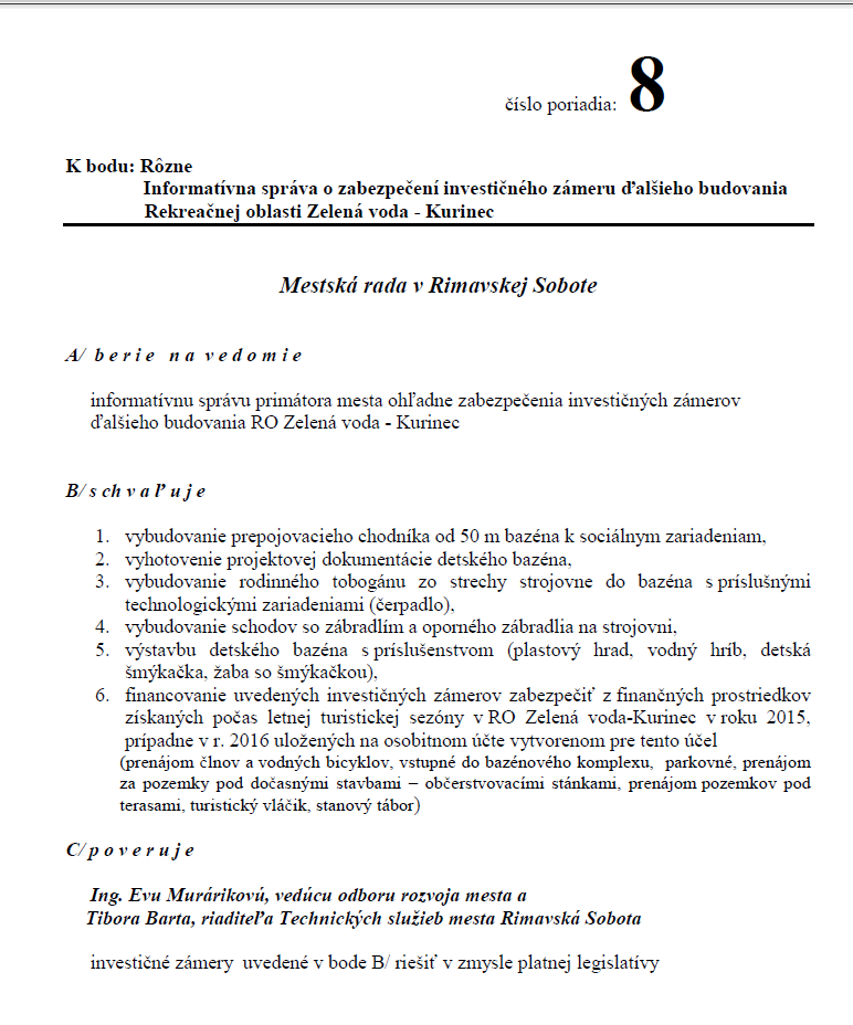Ako však Šimko ozrejmil, jeho cieľom je investovať do Kurinca zo ziskov a nie z rozpočtu mesta. "Ak mi to neodsúhlasíte, zastavujem všetko, nemám iné východisko, neviem pokračovať," podotkol primátor.