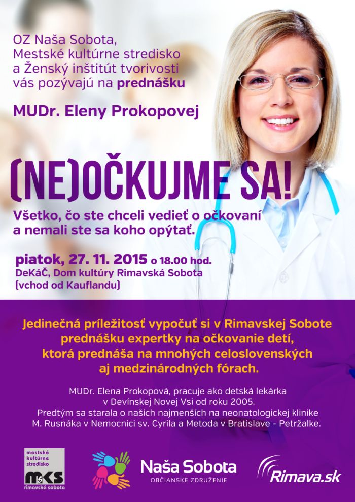 Expertka na očkovanie detí, ktorá prednáša na medzinárodných aj celoslovenských fórach zavíta aj do Rimavskej Soboty. Prednáška má názov (Ne)očkujme sa! Expertka Elena Prokopová odpovie na všetko čo ste chceli vedieť o očkovaní, ale nemali ste sa koho opýtať.