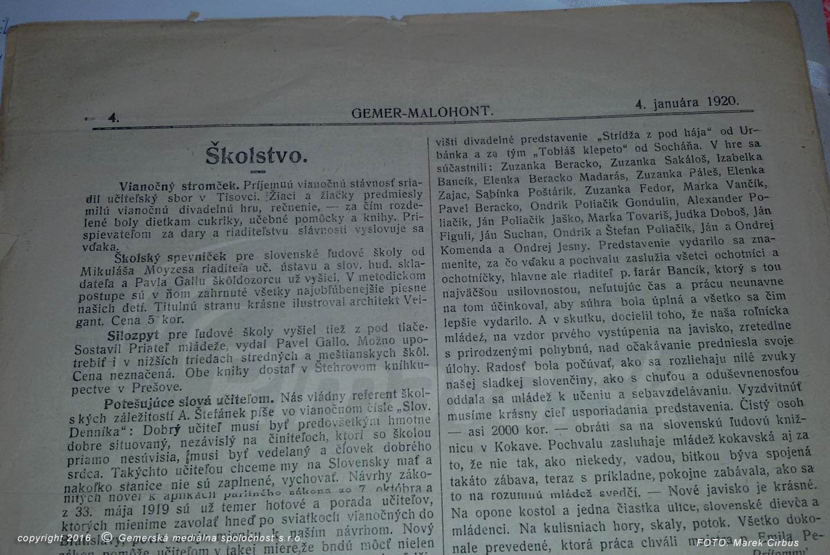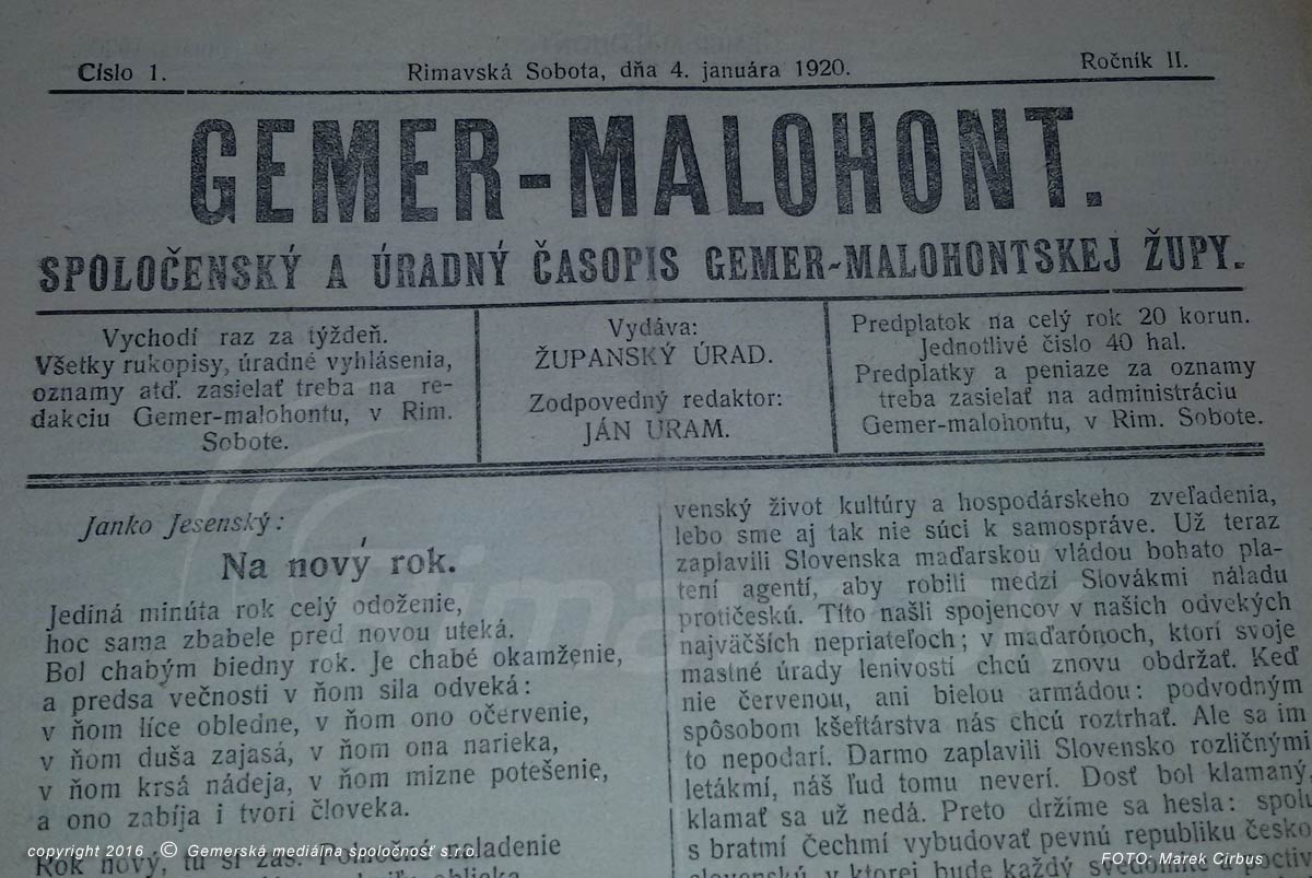Začiatkom 20. storočia sa ku Gömöri ujság pridáva ďalší týždenník Gömör-Kishont. Po prvej svetovej vojne sa na „predajné pulty“ dostáva aj slovenské periodikum, týždenník Gemer-Malohont, pár ročníkov má okrem múzea vo svojom fonde aj Knižnica Mateja Hrebendu v Rimavskej Sobote. Obsah tohto týždenníka tvorili rôzne témy či pozvánky na podujatia, dokonca aj pozvánky na valné zhromaždenia niektorých inštitúcií. Písalo sa aj o atmosfére na podujatiach, napríklad na školskej slávnosti pred príchodom vianočných sviatkov. „Príjemnú vianočnú stávnosť sriadil učiteľský sbor v Tisovci. Žiaci a žiačky predmiesly milú vianočnú divadelnú hru, rečnenie, za čím rozdelené boly dietkam cukríky, učebné pomôcky a knihy. Prispievateľom za dary a riaditeľstvu slávnosti vyslovuje sa vďaka,“ uvádza sa v jednom úryvku z článku Gemer-Malohontu.