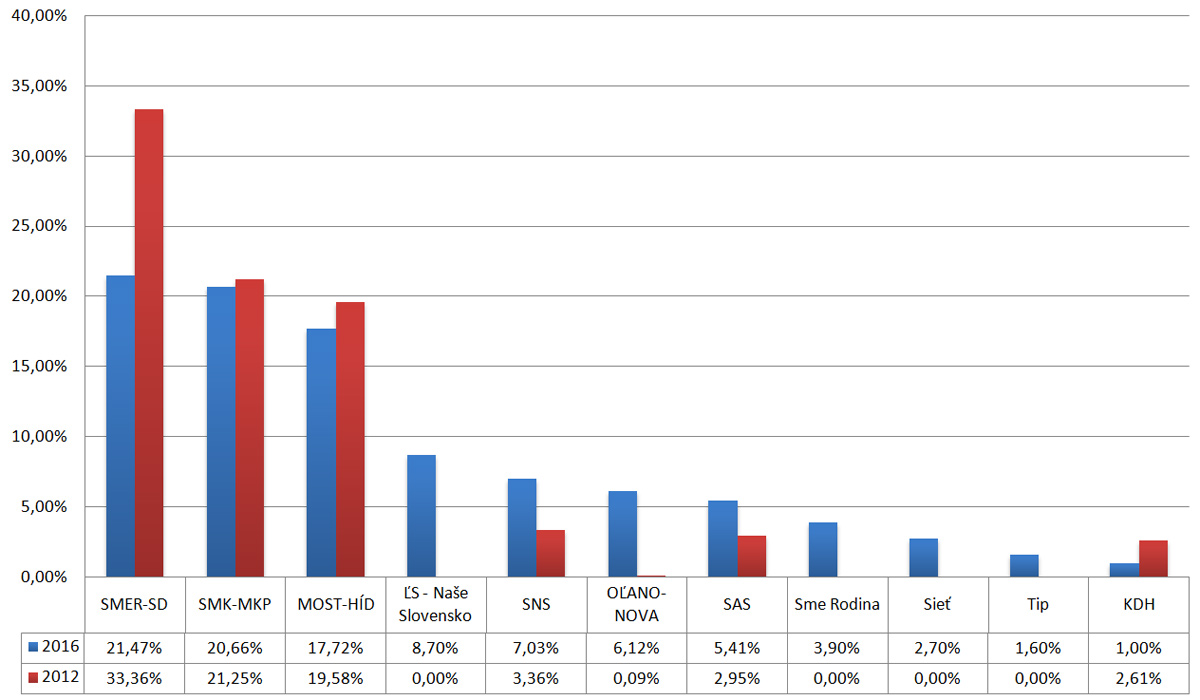 Graf: Porovnanie výsledkov parlamentných volieb v rokoch 2016 a 2012 v okrese Rimavská Sobota