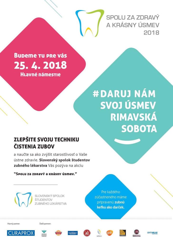 Dentálna hygiena je v poslednom období pomerne častou témou nielen v zubnej ambulancii, ale aj v rozhovoroch medzi ľuďmi. Každý by chcel mať zdravý chrup ako aj krajší úsmev.O tom ako ho získať i udržať Vám priblížia študenti zubného lekárstva v stredu, 25. apríla, na Hlavnom námestí v Rimavskej Sobote. Od 10:00 hod. sa tam uskutoční podujatie Spolu za zdravý a krásny úsmev, ktoré organizuje Slovenský Spolok Študentov zubného lekárstva.