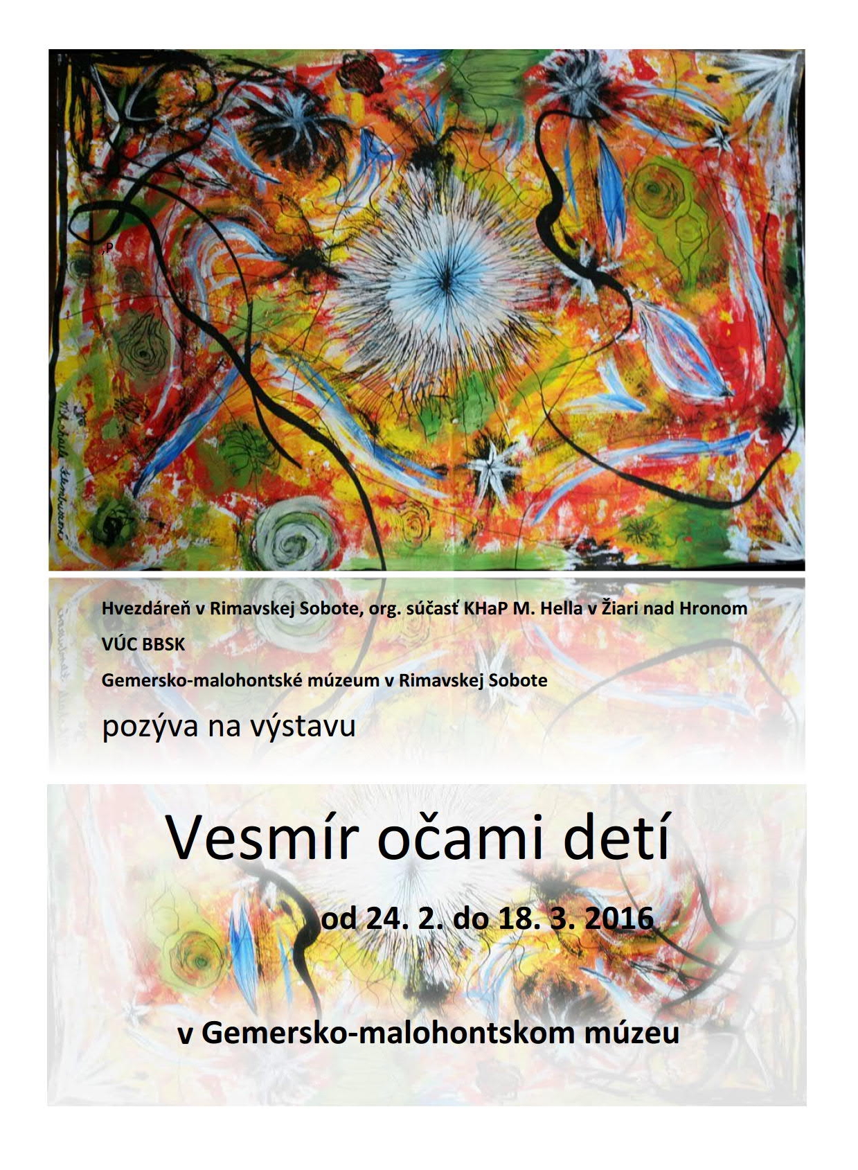 V Gemersko-malohontskom múzeu v Rimavskej Sobote sa v nadchádzajúcich dňoch budete cítiť ako vo vesmíre. Postarajú sa o to deti z 24 škôl z okresu, ktoré sa zapojili do súťaže Vesmír očami detí, ktorú organizuje Hvezdáreň v Rimavskej Sobote. Pre návštevníkov múzea čaká viac ako 260 detských výtvorov, ktoré si môžu pozrieť od stredy, 24. februára od 14:30 hod., kedy oficiálne otvoria túto výstavu a potrvá až do 18. marca. Okrem otvorenia výstavy bude v stredu práce hodnotiť odborná porota a zároveň tie najlepšie aj odmení.