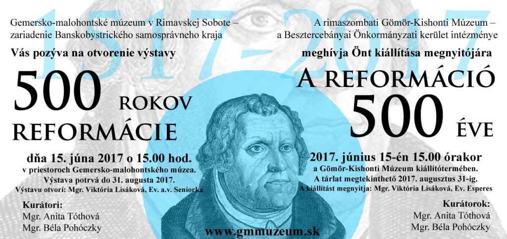 Reformovaná kresťanská cirkev slávi tento rok svoje 500. výročie od svojho vzniku. Jej históriu priblíži výstava „500 rokov reformácie (1517 – 2017), ktorej vernisáž sa uskutoční vo štvrtok, 15. júna o 15.00 hod. v priestoroch Gemersko-malohontského múzea v Rimavskej Sobote. „Výstava vznikla v spolupráci s Bélom Pohóczkym mladším, kňazom reformovanej cirkvi zo Širkoviec, ktorý so svojim otcom zozbieral veľký počet historických kníh, predmetov a dokumentov súvisiacich s reformáciou,“ uviedla pre Rimava.sk Anita Tóthová, historička múzea. Návštevníci si výstavu budú môcť pozrieť do 31. augusta.