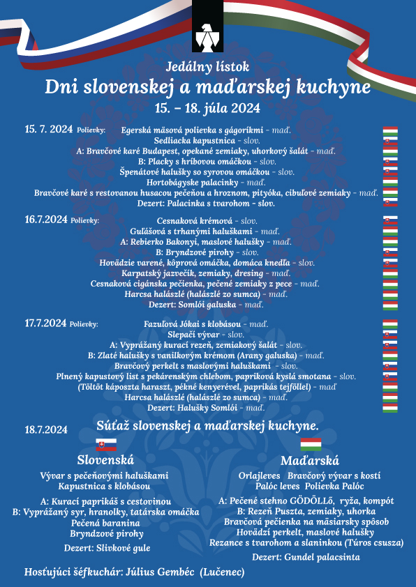 "Vyvrcholenie bude vo štvrtok, 18. júla, súťažou tímov, kde sa rozhodne, kto predá viac obedov – slovenský alebo maďarský tím. Príďte podporiť svoj obľúbený tím a zažiť deň plný chutí a súťaženia," dodáva riaditeľ školy.