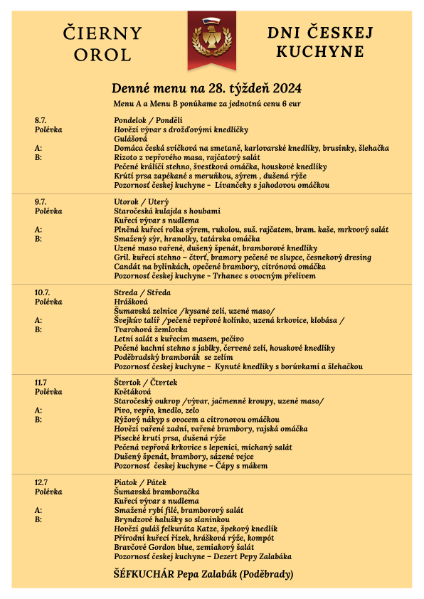 Prvý júlový týždeň sa návštevníci môžu tešiť na Dni českej kuchyne. Šéfkuchárom bude Pepa Zalabák z Poděbrad, ktorý prinesie autentické chute českých jedál. Okrem toho bude metodicky radiť žiakom v otázkach českej kuchyne, čím podčiarkne vzdelávací charakter tohto podujatia. "Naše školy sú dlhodobo prepojené a takéto podujatia a školenia sú súčasť nášho vzdelávacieho programu,“ povedal Jaroslav Bagačka, riaditeľ Strednej odbornej školy obchodu a služieb v Rimavskej Sobote.