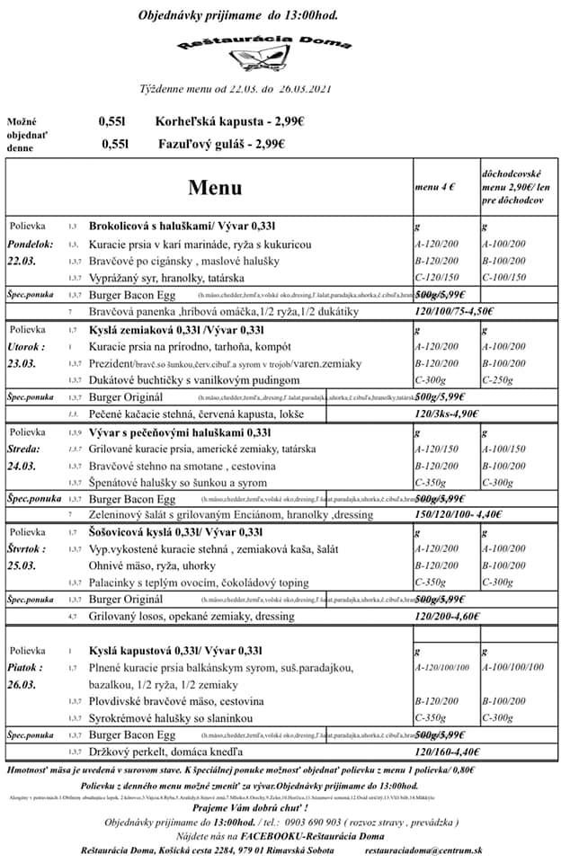 V aktuálnom týždennom menu majú na výber štyri jedlá vrátane polievky za 4 eurá. Jedným z nich je špeciálna ponuka. V priebehu týždňa si tak môžete pochutnať na býčích žľazách na cibuľke, pečených kačacích stehnách s lokšou a červenou kapustou, vyprážanej panenke so zemiakovou kašou alebo na grilovanom lososovi. Denné menu nájdete na fb stránke Reštaurácia Doma alebo vo svojich schránkach.