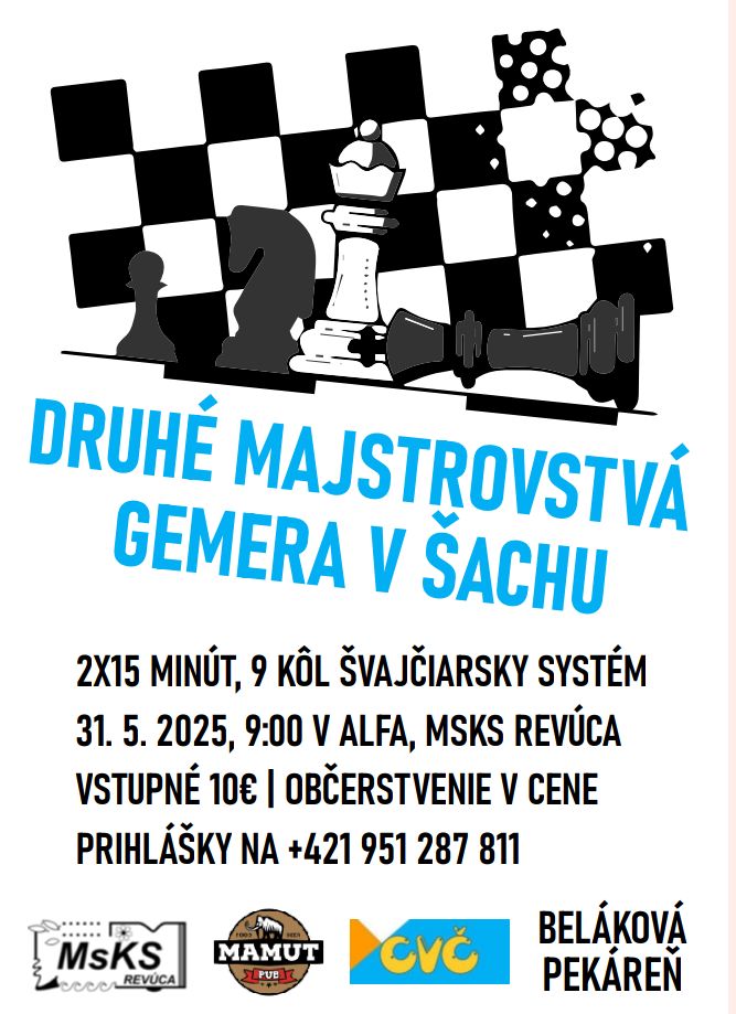 Po úspechu vlaňajšieho premiérového ročníka sa šachová komunita Gemera môže tešiť na pokračovanie. Druhé Majstrovstvá Gemera v šachu sa uskutočnia už 31. mája 2025 v sále Alfa Mestského kultúrneho strediska v Revúcej.