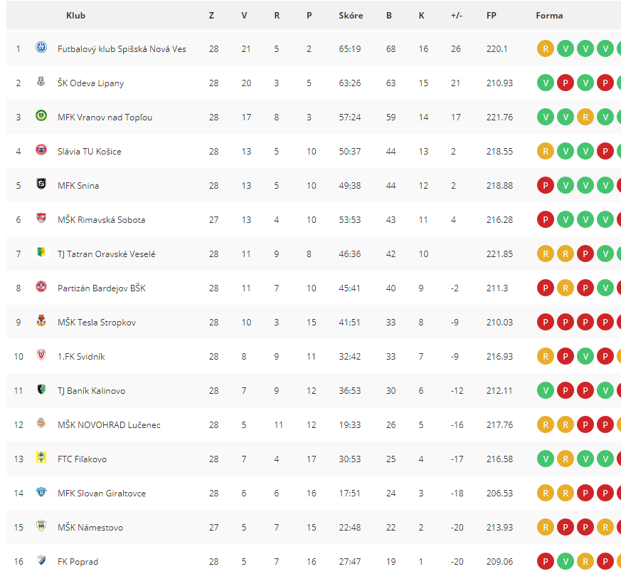 Ostatné výsledky: MŠK Novohrad – Spišská Nová Ves 0:0, Fiľakovo – Poprad 2:1, Stropkov – Kalinovo 3:4, Svidník – MFK Slovan Giraltovce 0:0, Oravské Veselé – Košice 2:2, Vranov nad Topľou – Snina 1:0, Lipany – Bardejov 3:0.