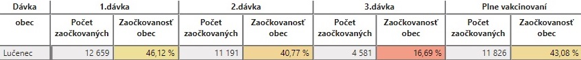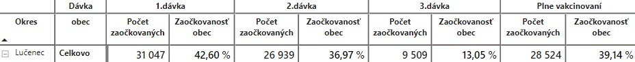 V Lučenci je počet očkovaných ľudí prvou dávkou 12 659, druhou dávkou 11 191 osôb, tretiu dávku zatiaľ prijalo 4 581 obyvateľov a plne zaočkovaných je 11 826 ľudí. V celom okrese Lučenec je zaznamenaných 31 047 zaočkovaných prvou dávkou, 26 939 druhou dávkou, treťou 9 509 osôb a plne zaočkovaných je 28 524 ľudí.