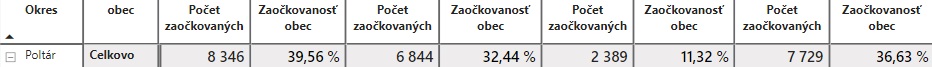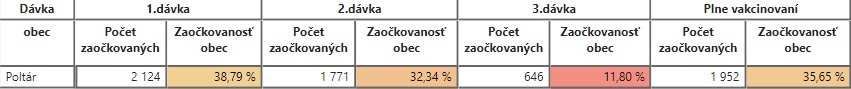 Poltár má 35,65 percent plne vakcinovaných obyvateľov, čo predstavuje 1 952 ľudí. Prvou dávkou je zaočkovaných 2 124 ľudí, druhou 1 771 a tretiu dávku prijalo 646 osôb. V poltárskom okrese zatiaľ prvú dávku vakcíny prijalo 8 346 osôb, druhú dávku 6 844 ľudí a tretiu 2 389 obyvateľov. Plne vakcinovaných v okrese je 7 729 ľudí.