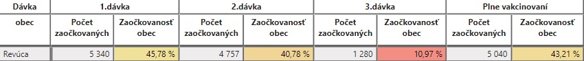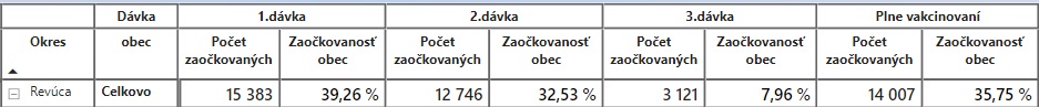 V Revúcej si pre prvú dávku vakcíny doposiaľ prišlo 5 340 ľudí, pre druhú 4 757 obyvateľov, pre tretiu 1 280 osôb a plne zaočkovaných je 5 040 ľudí. V revúckom okrese prvú dávku prijalo celkovo 15 383 ľudí, druhú 12 746, tretiu 3 121 a plne zaočkovaných je 14 007 obyvateľov.
