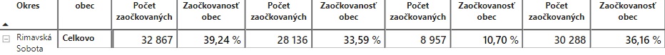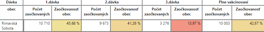 V celom okrese R. Sobota je zaočkovaných 32 867 ľudí prvou dávkou, počet zaočkovaných druhou dávkou je 28 136, treťou je 8 957 osôb a plne vakcinovaných je 30 288 obyvateľov.