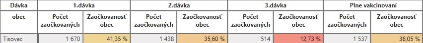 Čísla v Tisovci sú nasledovné: prvou dávkou je zaočkovaných 1 670 ľudí, druhou 1 438 obyvateľov, tretiu dávku prijalo 514 ľudí a plne vakcinovaných je 1 537 osôb.