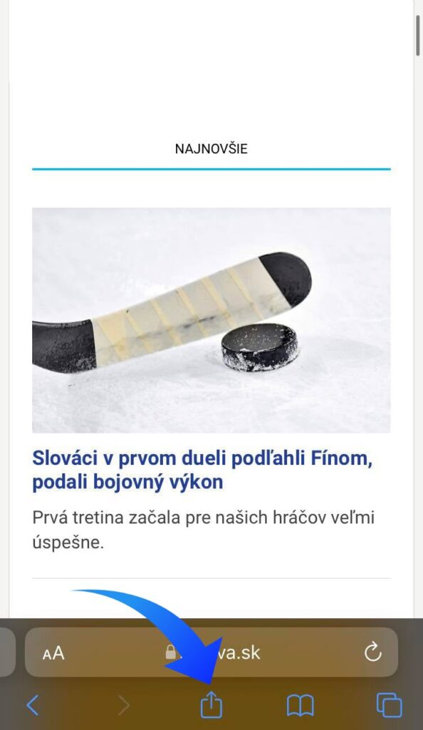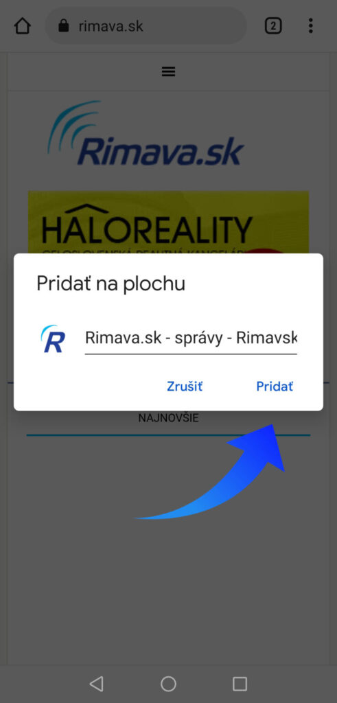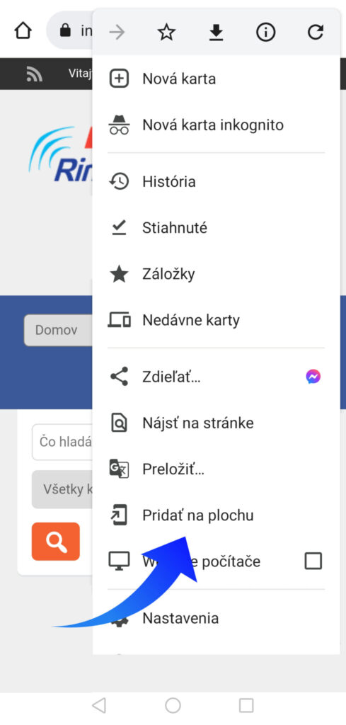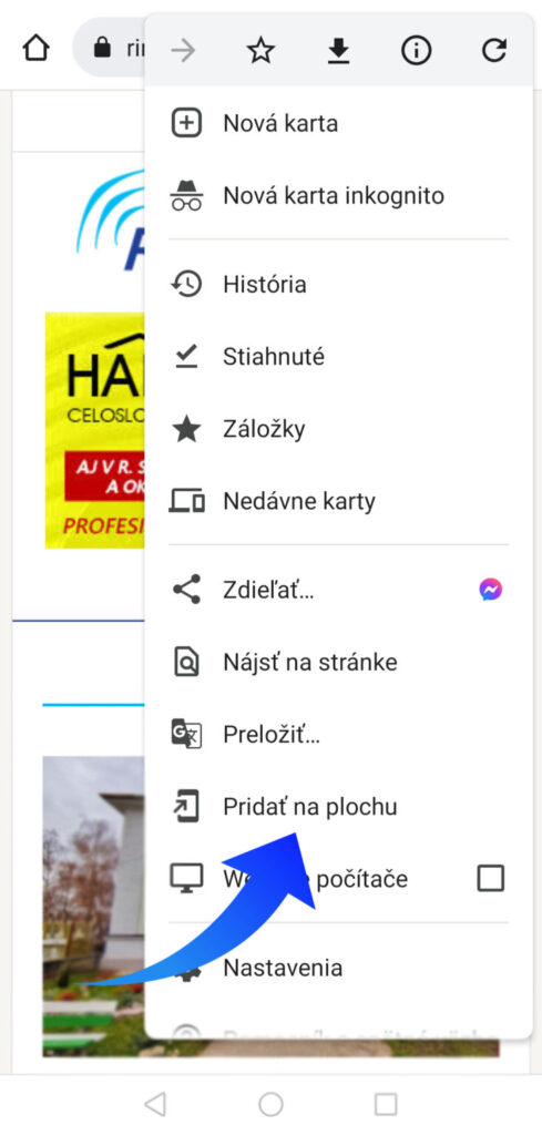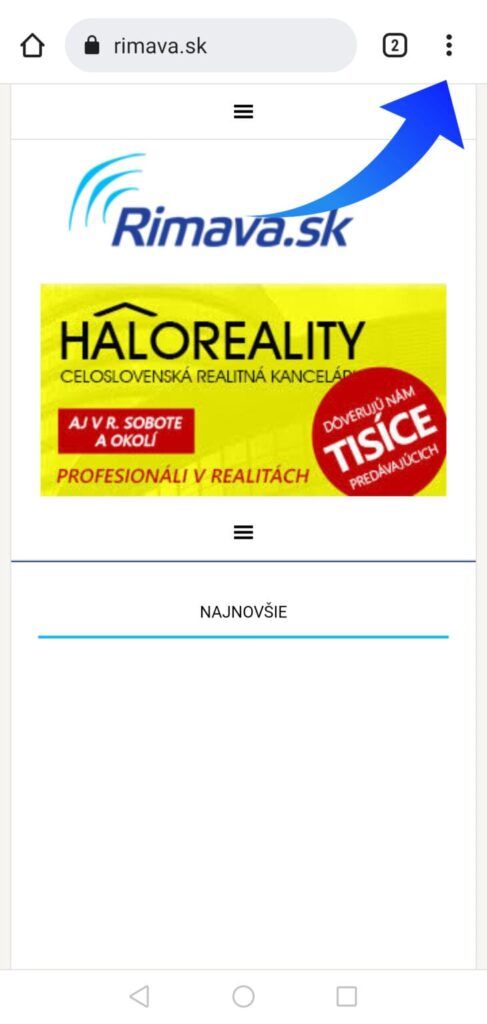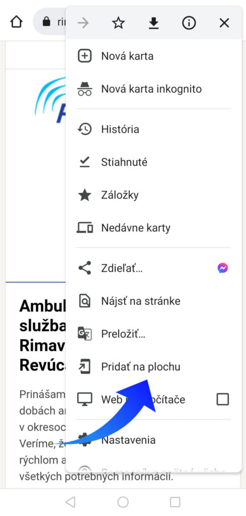 Najskôr si cez webový prehliadač otvorte na vašom mobilnom telefóne stránku www.rimava.sk. V pravom hornom rohu kliknite na možnosti, ktoré vám váš telefón ponúka tak, ako ukazuje šípka na obrázku.