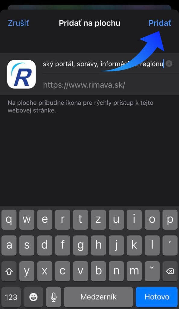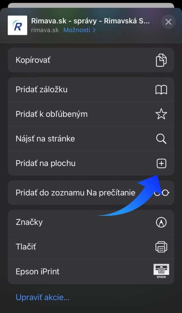 Rovnakým postupom si na svoju plochu telefónu môžete pridať aj jednotlivé sekcie, ktoré na našom portáli nájdete - menu.rimava.sk, inzercia.rimava.sk a ambulantná/lekárenská pohotovosť.