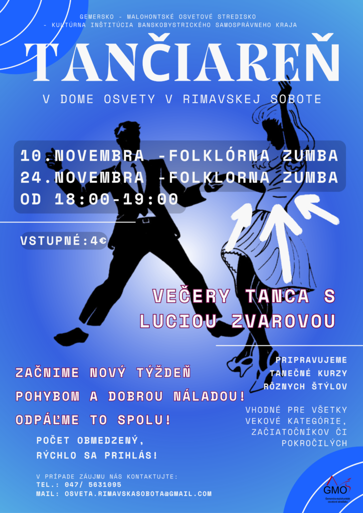 Gemersko-malohontské osvetové stredisko (GMOS), kultúrna inštitúcia Banskobystrického samosprávneho kraja, pozýva všetkých milovníkov pohybu, hudby a dobrej nálady do Domu osvety v Rimavskej Sobote.