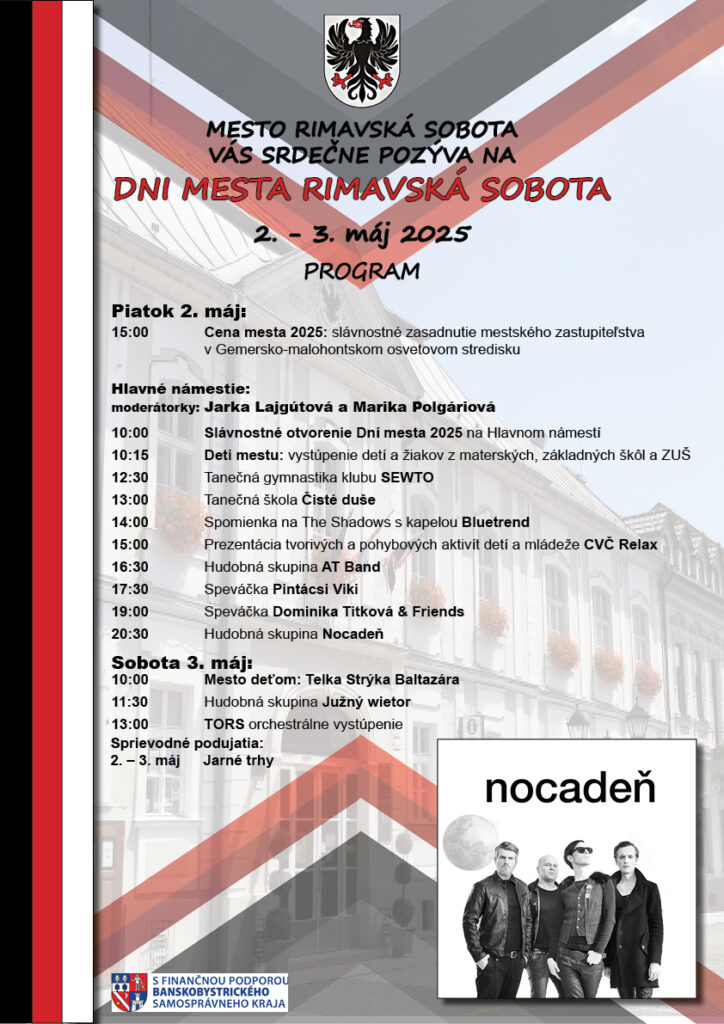 Prvý májový víkend bude v Rimavskej Sobote patriť tradičným Dňom mesta 2025. Počas dvoch dní – 2. a 3. mája – ožije centrum mesta hudbou, tancom, trhmi aj slávnostnou atmosférou.