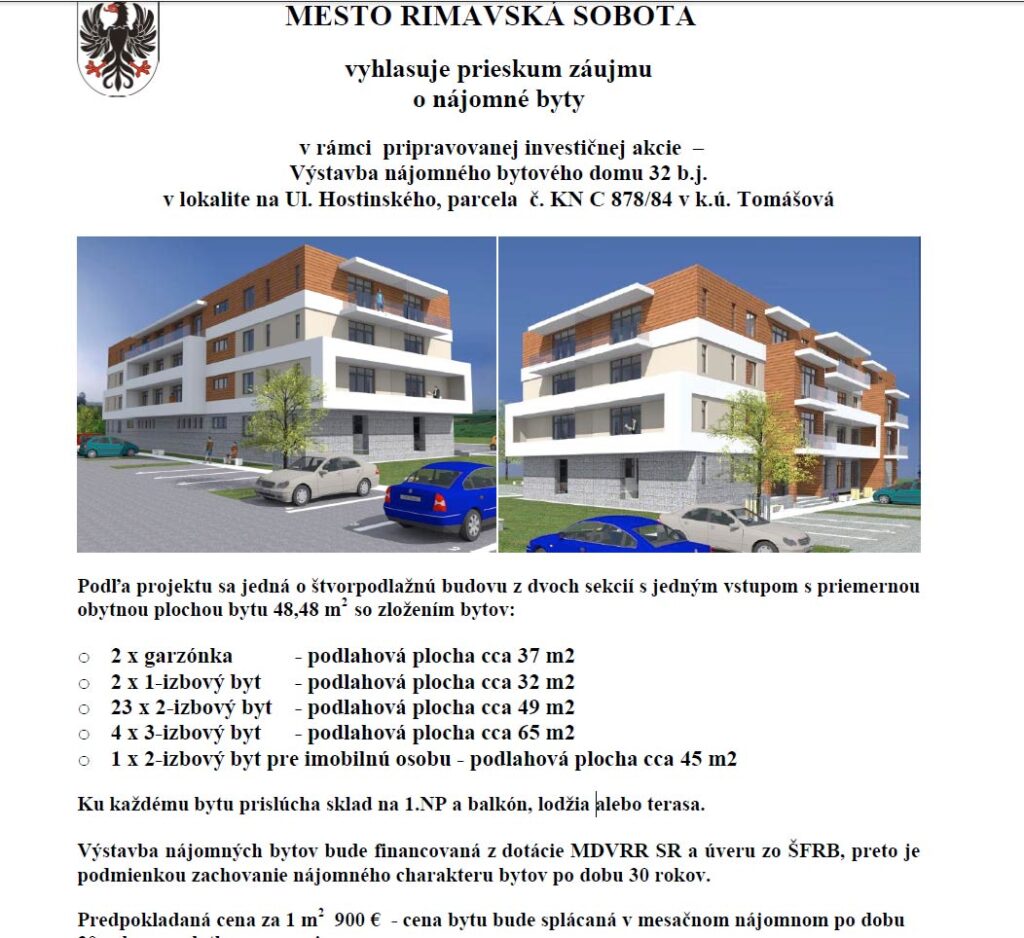 Mesto Rimavská Sobota sa chystá bojovať s nedostatkom dostupného bývania. Poslanec mestského zastupiteľstva Attila Halász predložil návrh na aktualizáciu investičného zámeru, ktorý by mal do mesta priniesť moderný bytový dom s 34 nájomnými jednotkami.