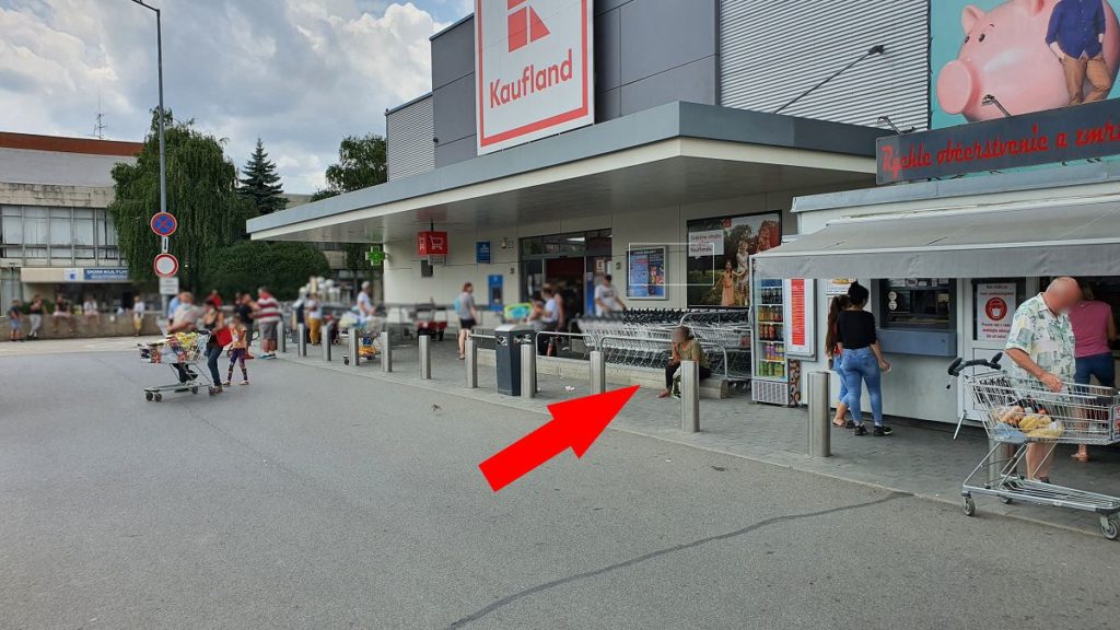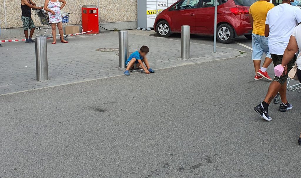 Dnes sme však asi osemročného chlapca opäť videli žobrať pred obchodným domom Kaufland. Sedel na jeho už tradičnom mieste pri stánku s rýchlym občerstvením, pred ním téglik na vyžobrané mince. Obďaleč sedela jeho údajná stará mama, v ruke mala takisto téglik.
