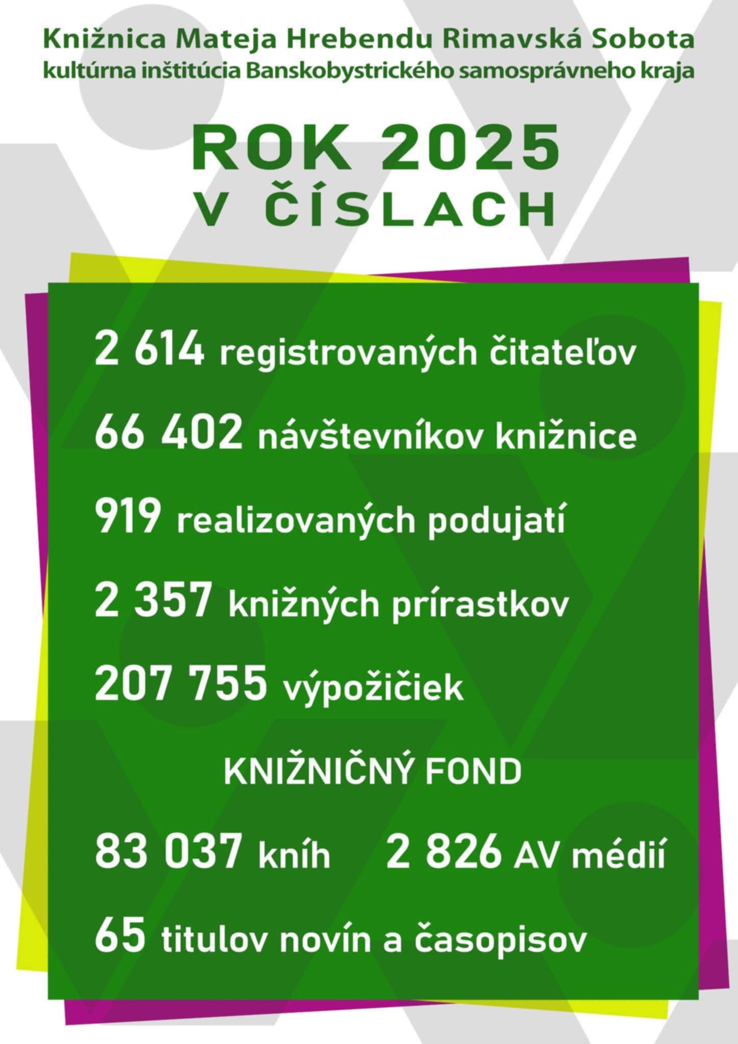 Ak by sme chceli rok 2025 zhrnúť do matematického vzorca, bol by to rok intenzívneho pohybu. Knižnicu navštívilo celkovo 66 402 ľudí, čo v prepočte znamená stovky návštev denne. Stabilnú základňu tvorí 2 614 registrovaných čitateľov, ktorí majú k dispozícii úctyhodný fond presahujúci 83-tisíc knižných titulov.