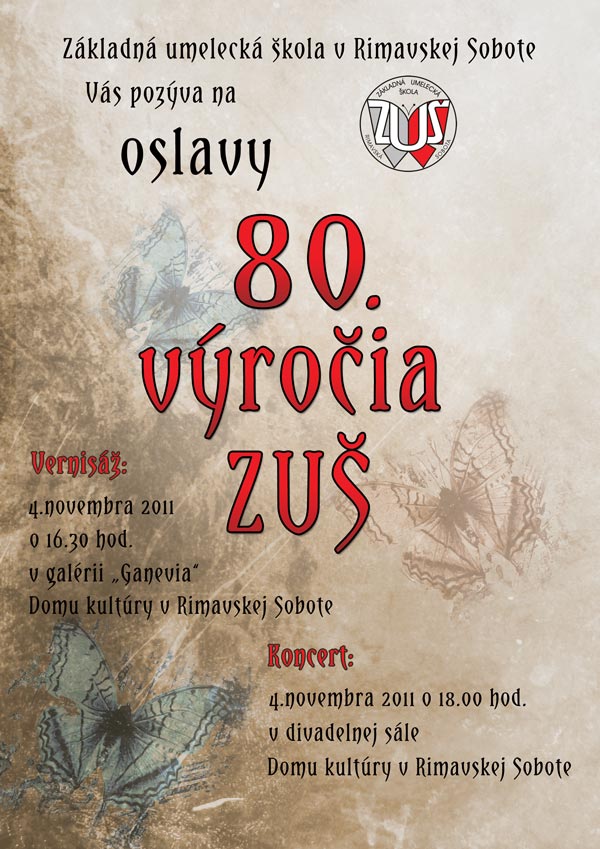 Otvorením výstavy v galérii, slávnostným koncertom aj krstom knihy o histórii umeleckého školstva v meste si Základná umelecká škola (ZUŠ) v Rimavskej Sobote pripomenie 80. výročie svojho založenia. Ako Rimava.sk informoval riaditeľ ZUŠ Marian Lacko, oslavy sú naplánované na piatok, 4. novembra. "Popoludní je na programe prijatie súčasných aj bývalých učiteľov na radnici, o 16.30 hod. v Galérii Ganevia otvoríme výstavu diel bývalých absolventov a pedagógov z výtvarného odboru, o 18.00 hod. bude nasledovať slávnostný koncert v Dome kultúry," avizuje riaditeľ školy. Podľa jeho slov sa počas koncertu predstavia bývalí žiaci hudobného odboru, medzi nimi napríklad flautistka Agneša Ujpálová, klaviristka Gabriela Ujpálová či speváčka Zuzana Mikulcová. Súčasťou večerného programu bude aj krst knihy s názvom Pohľady do minulosti a prítomnosti umeleckého školstva v Rimavskej Sobote. Tá mapuje históriu, spomína bývalých aj terajších učiteľov, výborných absolventov, činnosť jednotlivých odborov, premeny školy aj jej úspechy.