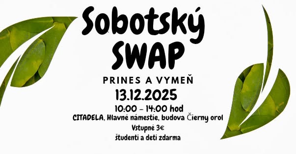 Ak máte pocit, že je najvyšší čas osviežiť si šatník, policu s knihami či byt bez zbytočných nákupov, tento SWAP je presne pre vás. Príďte 13. decembra medzi 10:00 – 14:00 hod a staňte sa súčasťou komunity, ktorá verí v hodnoty, udržateľnosť a radosť z výmeny.