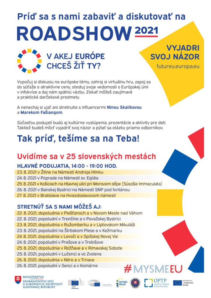 RIMAVSKÁ SOBOTA/ROŽŇAVA/LUČENEC - Roadshow 2021, ktorá sa zameriava na európske témy, zavíta aj do miest našich regiónov. Súčasťou Roadshow bude diskusia, spoločenská hra a stretnutie s influencermi Ninou Skalikovou a Marekom Fašiangom.